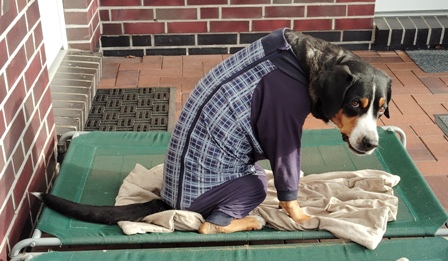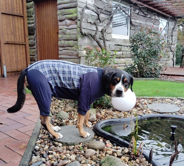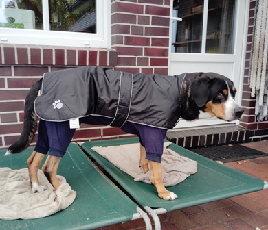 Da sie auch Nähte an einem Knie und an einem Ellenbogen hat, brauchten wir einen Body mit Ärmel. Deshalb trägt sie nachts und wenn wir nicht da sind einen "Schlafanzug". Er stört sie überhaupt nicht, auch wenn es auf den Bildern anders aussieht.