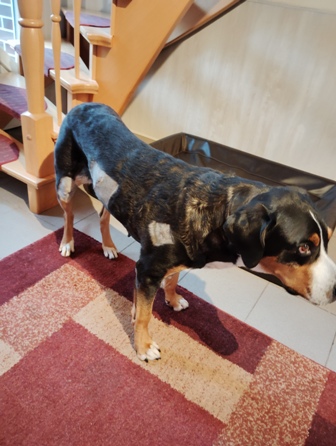 Nach einem aufregenden Wochenende mit Besuch der Hundeschule (fortgeschrittene Junghunde), Besuch von Bruder Eyk und vielen fremden Menschen bei uns, hat sich Enna zur Ruhe begeben: