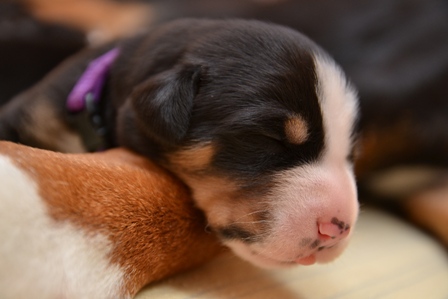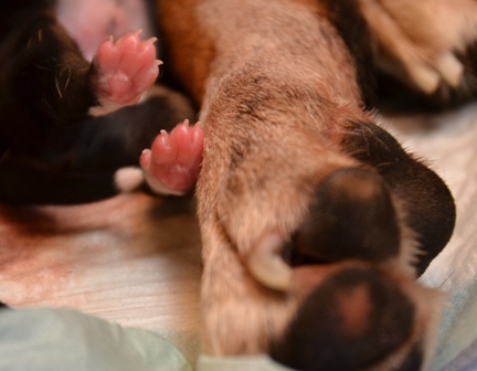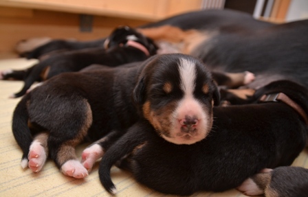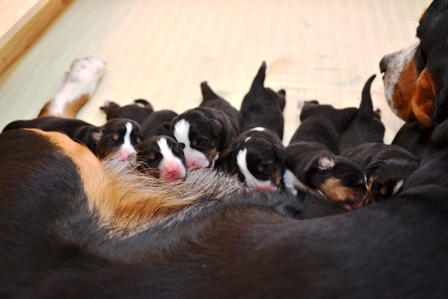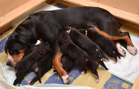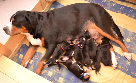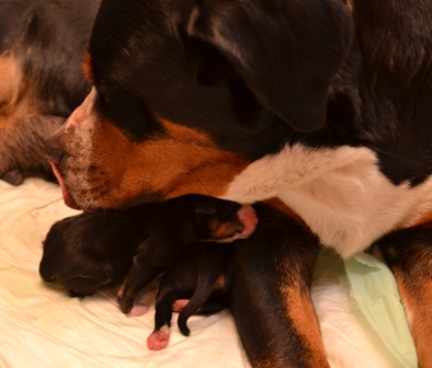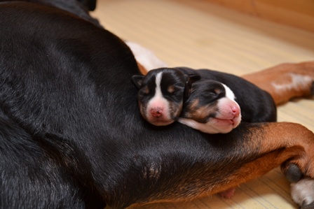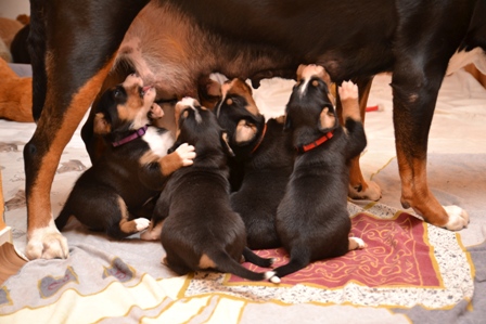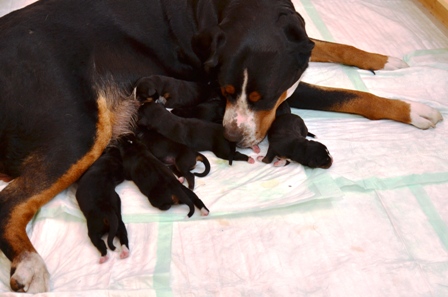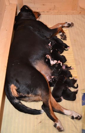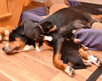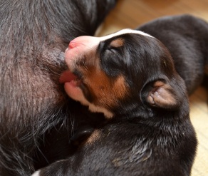 Sie ist, wie auch beim A- und B-Wurf, wieder durch und durch Mama. Den kleinen Mäuschen geht es gut und sie nuckeln schon kräftig Mamas leckere Milch.