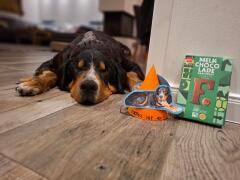 Juna/Core muss sich wegen eines Kreuzbandrisses und gelungener OP noch schonen. Die Katze hilft dabei: